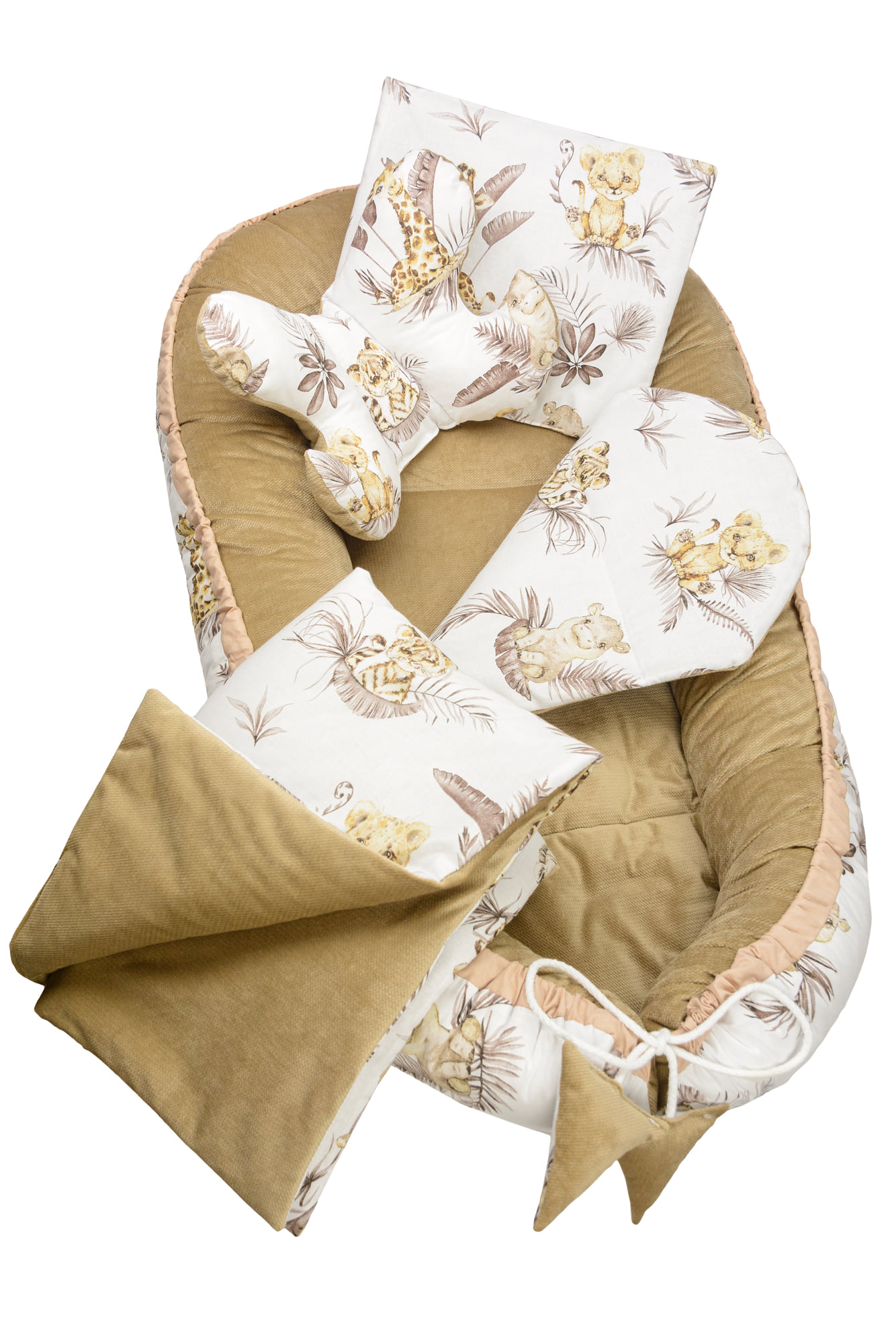 Kokon uszyty jest z bezpiecznych materiałów najwyższej jakości. Zestaw jest dwustronny. Jedna strona została wykonana z tkaniny bawełnianej 100%, druga natomiast z miłego w dotyku, ciepłego Velvetu.