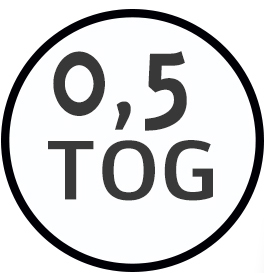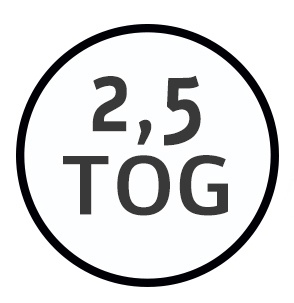 - 2.5 Tog – całoroczny – wykonany z dwóch warstw materiału z ciepłym wypełnieniem, przeznaczony do całorocznego użytkowania i temperatury pokojowej w zakresie 15-21 °C